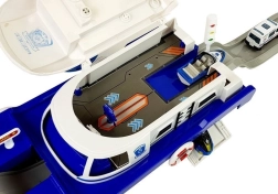 Ta solidna policyjna łódź na kółkach oferuje szereg interaktywnych elementów: otwierany górny pokład, tylną rampę najazdową dla pojazdów oraz schowek pod pokładem. Wieża sterownicza emituje policyjne sygnały świetlne i dźwiękowe (baterie AG13 w zestawie). Dzięki dopracowanym detalom, takim jak koła ratunkowe i napisy, zabawa jest realistyczna i wciągająca.