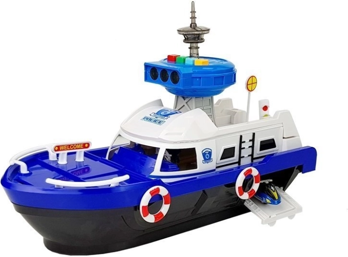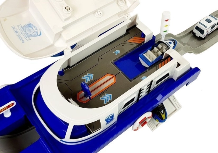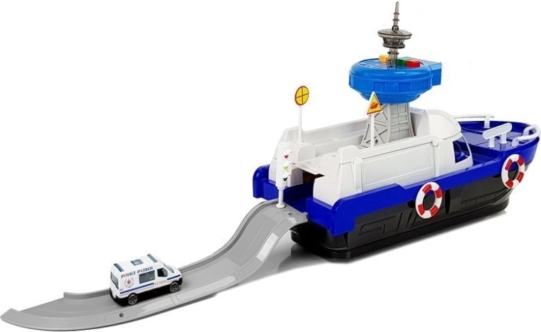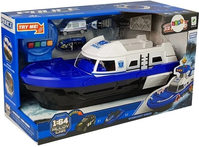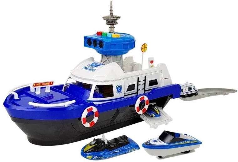 Podaruj dzieciom godziny kreatywnej zabawy z tą policyjną łodzią transportową w kolorze niebiesko-białym. Zestaw zawiera policyjny samochodzik, łódkę i skuter, funkcjonalną rampę ułatwiającą załadunek oraz efekty świetlne i dźwiękowe. Otwierany pokład i tajne schowki pod pokładem wspierają wyobraźnię i realistyczną zabawę, a dołączone znaki drogowe pomogą w nauce pierwszych zasad ruchu drogowego.