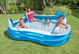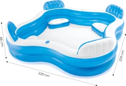 Rodzinny nadmuchiwany basen INTEX 229 × 229 cm z 4 siedziskami z oparciami i 2 uchwytami na napoje z wytrzymałego PVC. Wygodne siedzenie, szybkie spuszczanie wody i świetna zabawa dla dzieci i dorosłych.