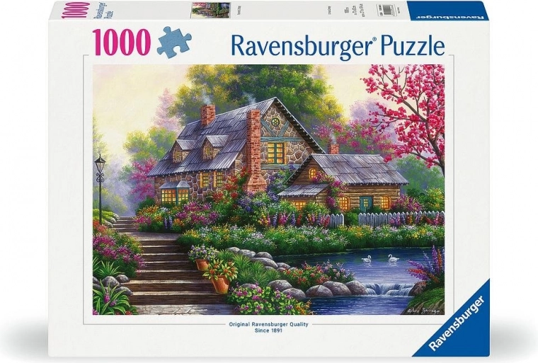 Dla miłośników spokoju i pięknych krajobrazów puzzle Romantyczna chata to idealny wybór. Szczegółowa ilustracja malowniczej chatki nad jeziorkiem z kaczkami oraz kwitnącego ogrodu przeniesie Cię w świat harmonii. Dzięki najwyższej jakości marki RAVENSBURGER możesz liczyć na precyzyjne wycięcia, wytrzymały karton i nasycone kolory.