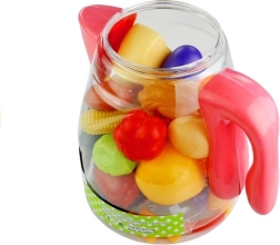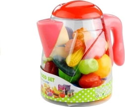 Odkryj kolorowy zestaw jedzenia w praktycznym dzbanku z czerwoną rączką. Każdy element tego zestawu został starannie wykonany z bezpiecznego, certyfikowanego plastiku, co gwarantuje beztroską zabawę. Dzbanek z uchwytem ułatwia przenoszenie.