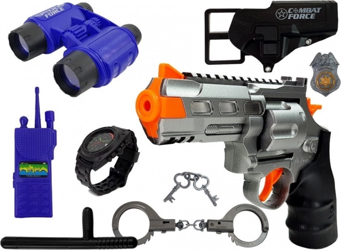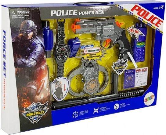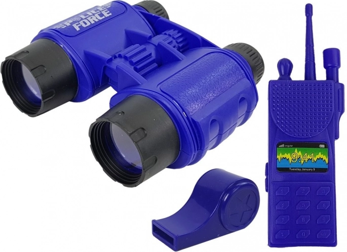 Kajdanki z kluczykami, odznaka, krótkofalówka, gwizdek i lornetka – wszystko, czego mały policjant potrzebuje do ekscytującej misji.