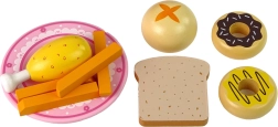 W komplecie talerz i wybór produktów: pączki, pieczywo, frytki i pałka z kurczaka – idealne do serwowania i zabawy w kucharza.