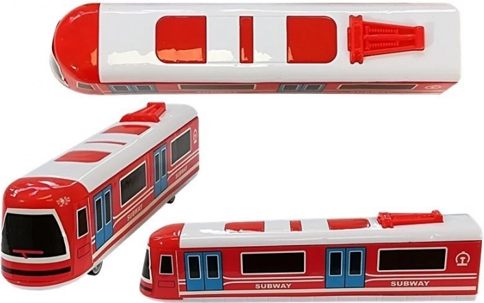 Żółty i czerwony wagon metra z realistycznymi oknami i napisem SUBWAY wzbogacą każdą dziecięcą kolej.