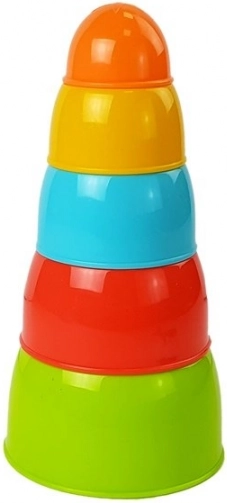 Kolorowy zestaw pięciu sztaplowanych miseczek dla dzieci od 12 miesięcy rozwija motorykę małą, koordynację i logiczne myślenie. Bezpieczne, zaokrąglone kształty, różne rozmiary i żywe kolory wspierają naukę przez zabawę – układanie, sortowanie oraz wkładanie jedna w drugą.