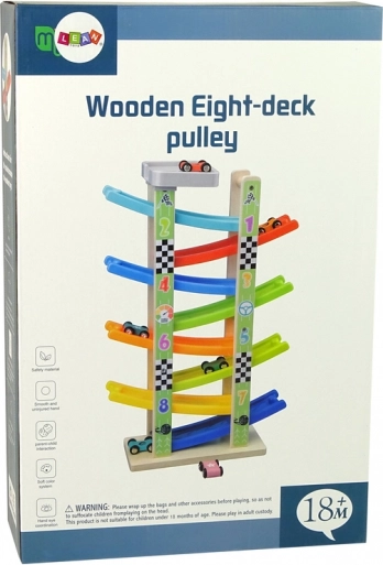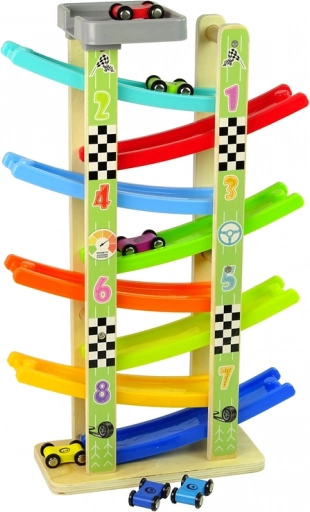 Ten kolorowy drewniany tor zjazdowy zainteresuje każde małe dziecko. Każde z 8 pięter jest oznaczone numerem, dzięki czemu dzieci w zabawny sposób utrwalają liczenie i rozróżnianie kolorów. Dzieci kładą autko na górnej platformie i obserwują, jak po pochyłych płaszczyznach żwawo się obraca i zjeżdża w dół. Zabawa, która wspiera logiczne myślenie oraz percepcję wzrokową.