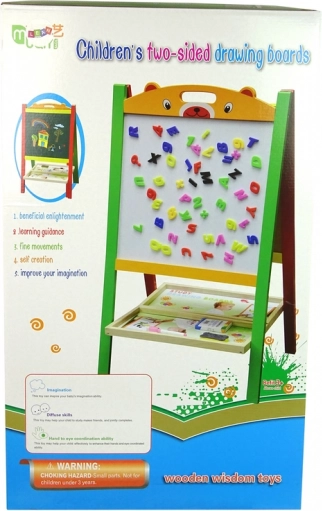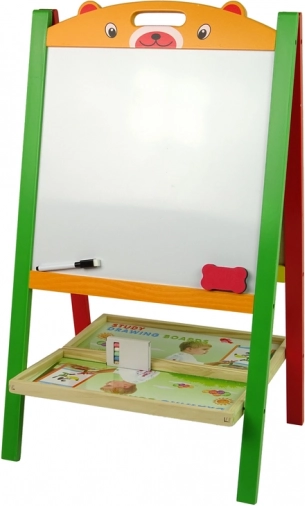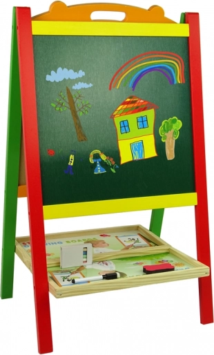 Ta drewniana, dwustronna tablica 2w1 wspiera dzieci w kreatywnym wyrażaniu się oraz we wczesnej edukacji. Na białej stronie można pisać i rysować markerem suchościeralnym, zielona powierzchnia magnetyczna jest idealna do układania słów z literek i ćwiczenia liczenia z użyciem cyfr i znaków. Stabilna rama i praktyczna półeczka/szufladka pomagają mieć wszystko pod ręką.