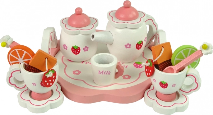 Drewniany różowy zestaw do herbaty z kwiatami i truskawkami