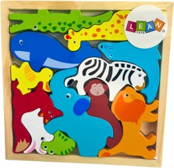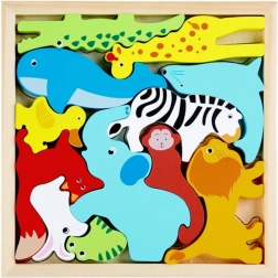 Ta kolorowa drewniana układanka przynosi dzieciom radość z odkrywania świata zwierząt. Zadaniem jest prawidłowe dopasowanie poszczególnych elementów–zwierzątek do podstawy – każdy element ma inny kształt, dzięki czemu dzieci ćwiczą percepcję kształtów i cierpliwość. Zestaw zawiera 12 zwierząt, na przykład lwa, zebrę, małpkę czy orkę.