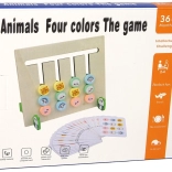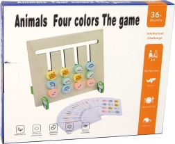 Drewniana gra Cztery kolory – zwierzęta łączy funkcję pomocy naukowej i układanki w jednej zabawce. Każda strona tablicy ma inne zadanie – jedna skupia się na kolorach, a druga na zwierzętach, takich jak królik, tygrys, pies i owca.