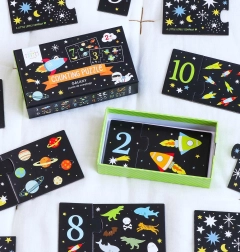 To edukacyjne puzzle z motywem kosmosu rozwija liczenie, logikę i motorykę małą. Dzieci dopasowują liczbę do ilustracji z odpowiadającą jej liczbą przedmiotów, dzięki czemu w formie zabawy utrwalają podstawowe umiejętności matematyczne.