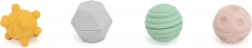 Lekkie, teksturowane zabawki o różnych powierzchniach i kształtach stymulują dotyk, masują dłonie i paluszki oraz wzmacniają chwyt. Odpowiednie do ćwiczenia motoryki małej i pierwszej koordynacji ręka–oko.