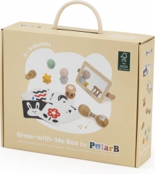 - W zestawie znajdziesz: karty kontrastowe, drewniane lusterko, toczącą się grzechotkę, dysk do przekładania, podwójne marakasy oraz zestaw piłeczek sensorycznych