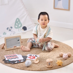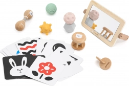 - Karty kontrastowe; drewniane lusterko; tocząca się grzechotka; dysk do przekładania; podwójne marakasy; zestaw piłeczek sensorycznych