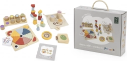 Ten starannie skomponowany box oferuje dzieciom od trzeciego roku życia szeroką gamę zabaw i aktywności do codziennego odkrywania. Tablica sensoryczna z ośmioma różnymi fakturami wzmacnia percepcję dotykową, okrągłe puzzle z kartami wspierają myślenie logiczne i koordynację oko–ręka, a drewniana książeczka emocji w przystępny sposób uczy rozpoznawania i nazywania uczuć. Nie brakuje też zabawy z kolorowymi kamieniami do balansowania, prostego mini labiryntu rozwijającego cierpliwość oraz gry pamięciowej doskonalącej koncentrację.