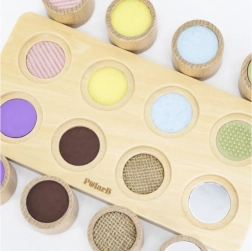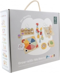 Dzięki wysokiej jakości drewnu i delikatnym pastelowym kolorom box jest bezpiecznym i estetycznym wyborem do pokoju dziecięcego i przedszkola. Przenośne pudełko z uchwytem ułatwia przechowywanie i podróżowanie, dzięki czemu nauka przez zabawę może odbywać się wszędzie.