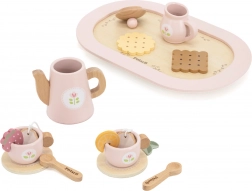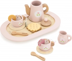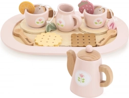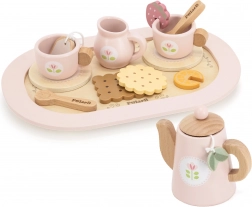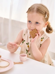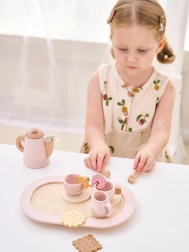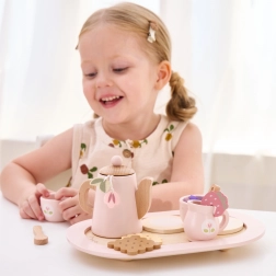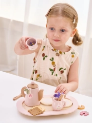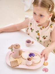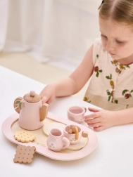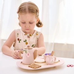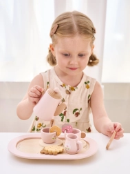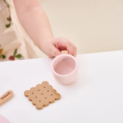 Zestaw oferuje wszystko, co potrzebne do serwowania: czajniczek z pokrywką, filiżanki ze spodkami, mlecznik, łyżeczki, torebki herbaty, plastry owoców i pachnące „ciasteczka” – wszystko na praktycznej tacy. Dzięki doborowi elementów to świetny dodatek do dziecięcego pokoju w duchu Montessori, a także piękny prezent, który ucieszy każdego małego gospodarza.