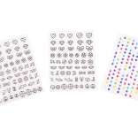 - 7× pisak/lakier z cienką końcówką i pędzelkiem, 4× brokat, naklejki (kontury i kolorowe kropki), ozdobne kamyki/naklejki, 2× separator palców, pilniczek w kształcie serca, mini suszarka do paznokci