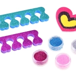 Cztery kolory brokatu i naklejki do efektownego zdobienia uzupełniają miękkie separatory palców – malowanie paznokci u stóp będzie wygodne i precyzyjne.