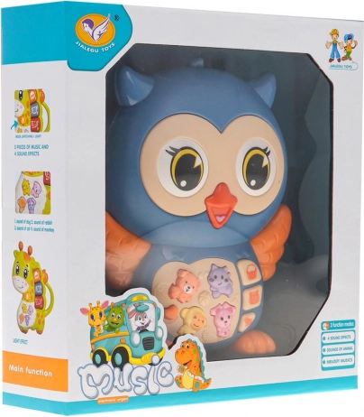 . | Interaktywna sowa z funkcją dźwiękową i świetlną dla dzieci od 6 miesięcy. Sowa jest wykonana z najwyższej jakości plastiku, odporna na uderzenia i bezpieczna dla maluchów, nie ma żadnych ostrych krawędzi. Sowa jest wykonana w żywych kolorach, aby przyciągać uwagę dziecka i zachęcać je do zabawy. Na brzuszku sowy znajduje się panel z przyciskami aktywującymi odgłosy zwierząt (w pierwszym trybie), melodie, dźwięki Do-Re-Mi (w drugim trybie) oraz efekty świetlne w postaci migających świateł na skrzydłach sowy. Tryby przełącza się przyciskiem w kształcie serca. Zabawka ma regulację głośności. Zasilanie: 2 baterie AA 1,5 V (brak w zestawie) .Funkcje zabawki: .- przeznaczona dla dzieci od 6 miesięcy, .- wykonana z najwyższej jakości plastiku w jaskrawych kolorach, .- bezpieczna, bez ostrych krawędzi, .- odporna na uderzenia, .- efekty świetlne: świecące skrzydła sowy, .- efekty dźwiękowe: .* tryb z odgłosami zwierząt: pies, kotek, małpa, owca, tygrys, słoń, .* tryb z dźwiękami: melodie, dźwięki Do-Re-Mi. |