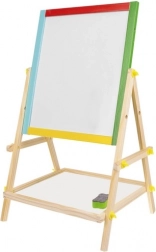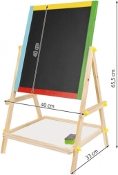 Stabilna drewniana konstrukcja z kolorowymi elementami jest trwała i bezpieczna dla dzieci. Praktyczna półka na akcesoria utrzymuje kredy, marker i gąbkę zawsze pod ręką. Łatwy montaż bez specjalnych narzędzi ucieszy każdego rodzica, a kompaktowe wymiary sprawdzą się w pokoju dziecięcym i bawialni.
