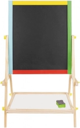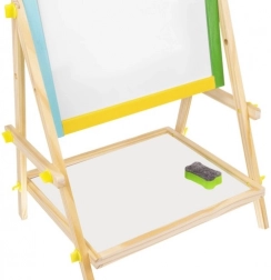 Kreatywna i bezpieczna dwustronna tablica 2w1 dla małych artystów – z jednej strony kredowa, z drugiej sucheścieralna i magnetyczna. Dzięki obrotowemu mechanizmowi, solidnej drewnianej konstrukcji i półce na akcesoria wspiera wyobraźnię, naukę i motorykę małą. W zestawie jest wszystko, czego trzeba do natychmiastowej zabawy: kredy, marker i gąbka.