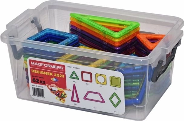 Magformers Designer 2023 zawiera bogatą paletę kształtów geometrycznych, w tym trójkąty, kwadraty i romby. Zestaw wspiera modelowanie nie tylko zwierząt i przedmiotów codziennego użytku, ale także obiektów abstrakcyjnych, co sprawia, że każdy zbudowany model jest unikatowy. Opakowanie zawiera: