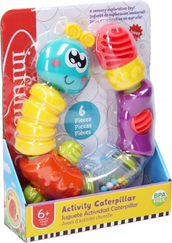 Urocza składana grzechotka w kształcie gąsienicy zapewnia dzieciom od 6 miesięcy mnóstwo zabawy i wsparcie rozwoju. Dzięki 6 łączonym elementom trenuje małą motorykę, koordynację ręka–oko oraz pobudza percepcję sensoryczną dźwiękiem grzechotek.