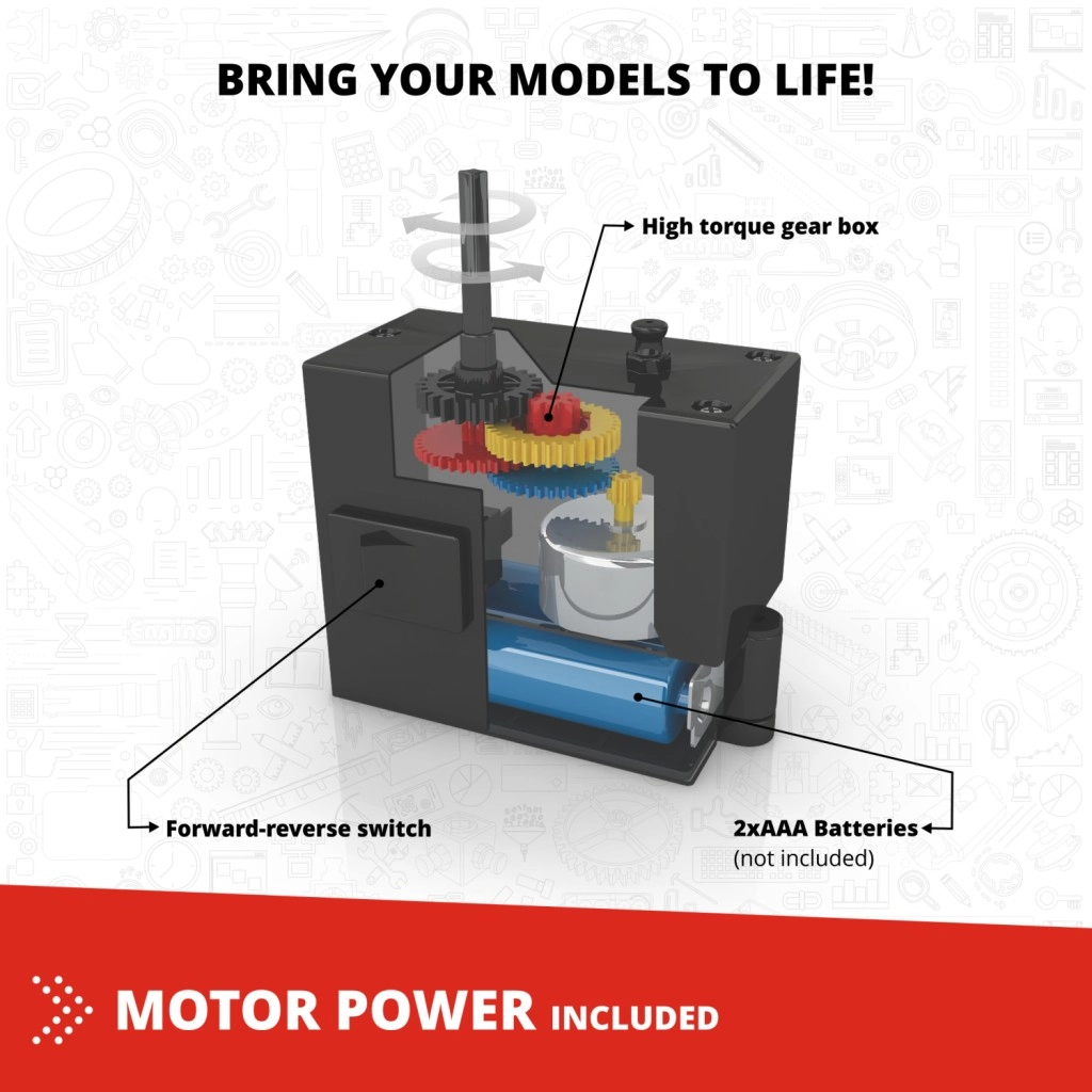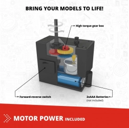 W zestawie znajduje się silniczek z ustawieniem kierunku ruchu. Ożyw swoje modele i pozwól im jeździć lub poruszać się.