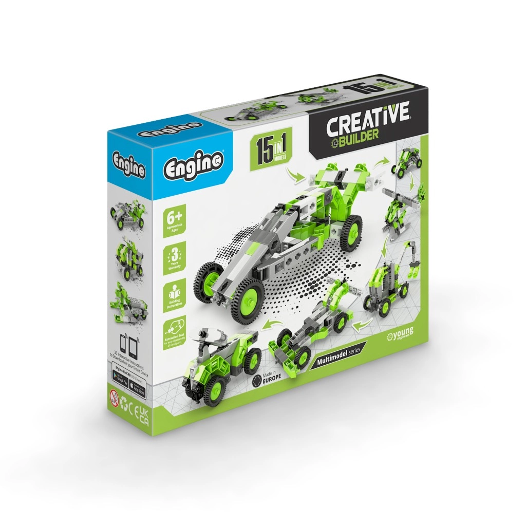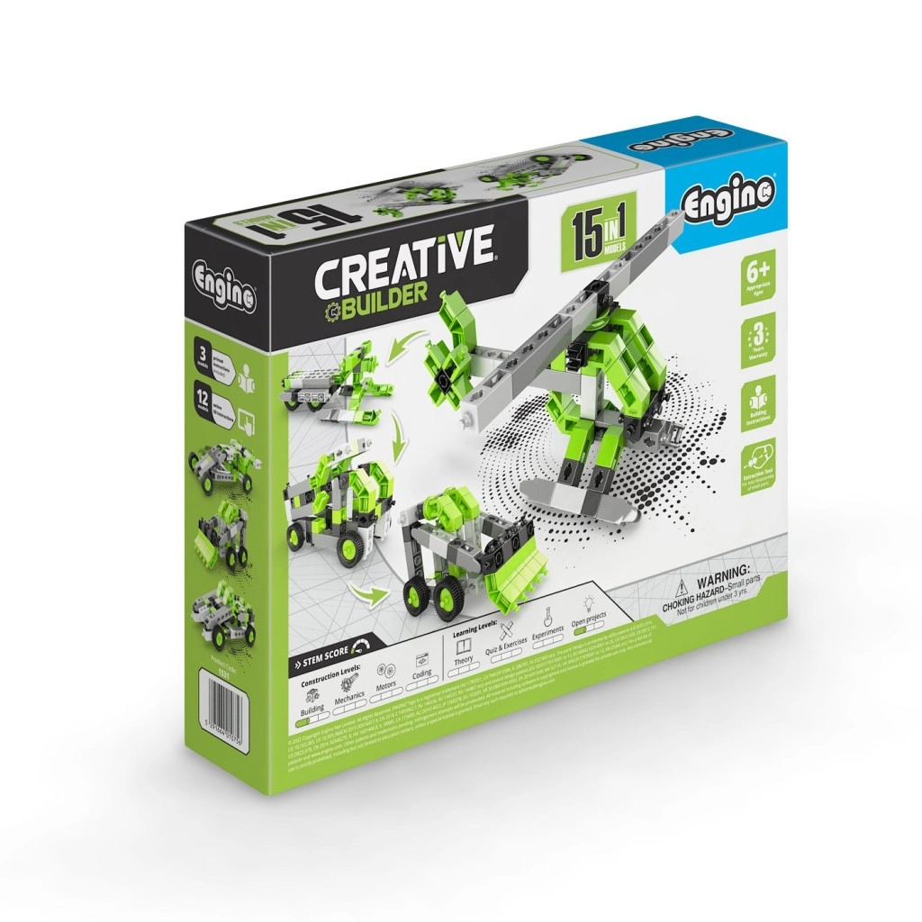 Zestaw Engino Creative Builder 15 w 1 zapewnia dzieciom godziny zabawy i nauki. Dzięki sprytnemu systemowi łączników dzieci łatwo przebudują jedną konstrukcję w kolejną i poznają różne zasady mechaniki. Intuicyjna aplikacja mobilna Engino kidCAD w języku polskim wyświetla modele w 3D, dzięki czemu można je obracać, przybliżać i budować krok po kroku.