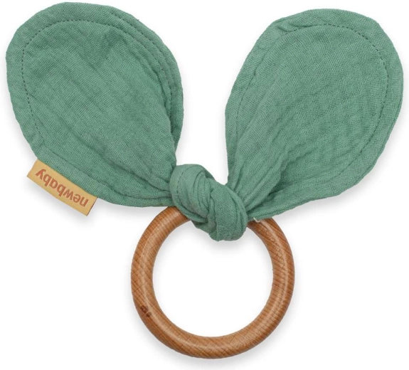 Gryzak New Baby Ears w miętowym kolorze łączy 100% organiczną bawełnę i drewno bukowe, co zapewnia bezpieczeństwo i naturalne materiały dla Twojego dziecka.