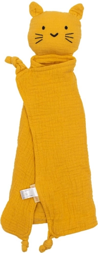 Wykonana w 100% z bawełny organicznej, ta przytulanka zapewnia miękki i przyjemny w dotyku materiał, który jest delikatny dla skóry niemowlęcia. Dzięki urokliwemu wzorowi kotka w musztardowym kolorze stanie się ulubionym towarzyszem każdego dziecka.