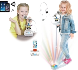 Z tym zestawem karaoke Bluetooth czeka Cię mnóstwo zabawy. Zawiera moduł karaoke, statyw z mikrofonem oraz mikrofon nagłowny, który zapewnia stabilne i wygodne śpiewanie nawet w ruchu. Panel sterowania jest wyposażony w uchwyt na telefon lub odtwarzacz MP3, dzięki czemu możesz łatwo śledzić teksty lub filmy.