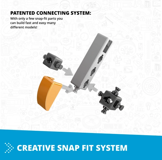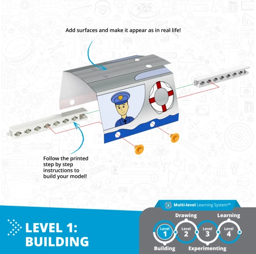 Dzięki przemyślanym poziomom – od prostego montażu, przez kreatywne kolorowanie papierowych elementów, aż po własne eksperymenty – mali odkrywcy przyswajają naukę w formie zabawy. Interaktywna aplikacja Engino kidCAD wyświetla modele 3D i ułatwia budowę krok po kroku.