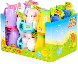 - Kolorowy zestaw bez dzbanka: 6 filiżanek, 6 talerzyków, 6 łyżeczek, 6 widelczyków i nożyków, solniczka, pieprzniczka, garnek z pokrywką, patelnia
