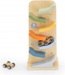 Kolorowy tor rampowy z autkiem zachęca do powtarzalnej zabawy, wzmacnia spostrzegawczość, koordynację i zrozumienie przyczyny oraz skutku.