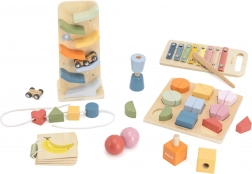 Ten starannie skomponowany zestaw VIGA dla wieku 18–24 miesięcy łączy ulubione drewniane zabawki w spójną całość. Znajdziesz w nim ksylofon do pierwszych muzycznych eksperymentów, zabawny tor samochodowy, układankę kształtów, elementy z gwintem, kształty do nawlekania oraz drewnianą książeczkę z obrazkami owoców. Każdy element został zaprojektowany tak, aby wspierać naturalny rozwój dziecka poprzez zabawę.
