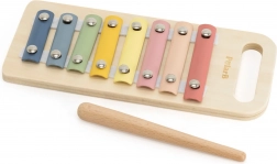 Pastelowy drewniany ksylofon wprowadza dzieci w świat dźwięków, rozwija słuch i poczucie rytmu oraz wspiera koordynację ręka–oko podczas uderzeń pałeczką.
