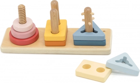 Drewniane elementy i kołki uczą rozpoznawania kształtów i kolorów, wspierają myślenie przestrzenne i logiczne sortowanie. Idealne na pierwsze kroki w geometrii.