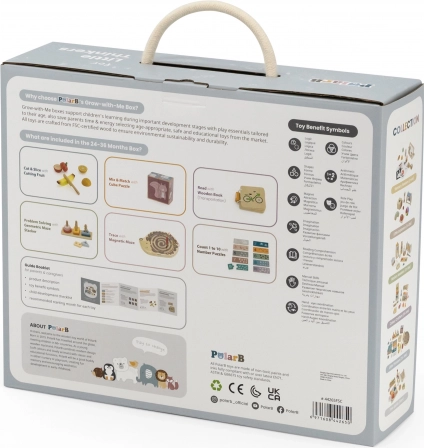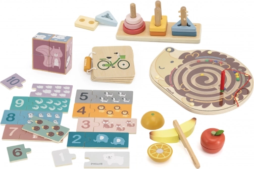 W zestawie znajdują się magnetyczny jeżowy labirynt, układanki i puzzle, zestaw owoców do krojenia oraz drewniana książeczka ze środkami transportu. Wszystko schowane w praktycznym pudełku z uchwytem dla łatwego przenoszenia. Idealny wybór dla małych odkrywców gotowych na bardziej zaawansowane zadania.