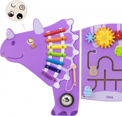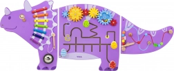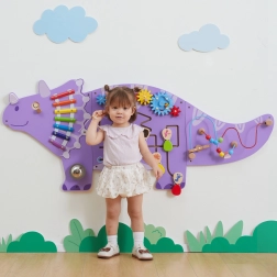 Kolorowa drewniana tablica ścienna w kształcie triceratopsa marki VIGA TOYS oferuje mnóstwo aktywności wspierających rozwój dzieci. Znajdziesz na niej ksylofon z pałeczką i dzwonek/gong, obrotowe koła zębate, labirynt z 5 otwieranymi jajkami (lusterko + mali dinozaurzy), zmieniające się oczy sterowane pokrętłem oraz pętlę motoryczną z wyrzutnią koralików. Świetna do ćwiczenia motoryki małej, koordynacji ręka–oko i sensorycznego odkrywania.