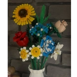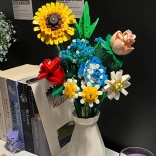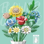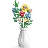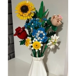 Zmień zestaw klocków w designerską dekorację. Kolorowy bukiet z elementów do budowania obejmuje słonecznik, róże, goździk, stokrotkę, lilię, niezapominajkę oraz zielone dodatki (liście haitong, cedr, trawa). W komplecie znajduje się też elegancki kremowy flakon, więc gotowy bukiet możesz od razu postawić na półce lub stole.