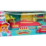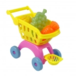Zawiera koszyk z żółtym wózkiem i plastikowymi owocami, idealny do zabawy w zakupy.