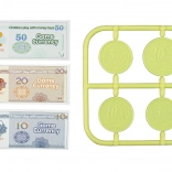 Zestaw zawiera papierowe banknoty i plastikowe monety, zaprojektowane do nauki dzieci o finansowej wiedzy.