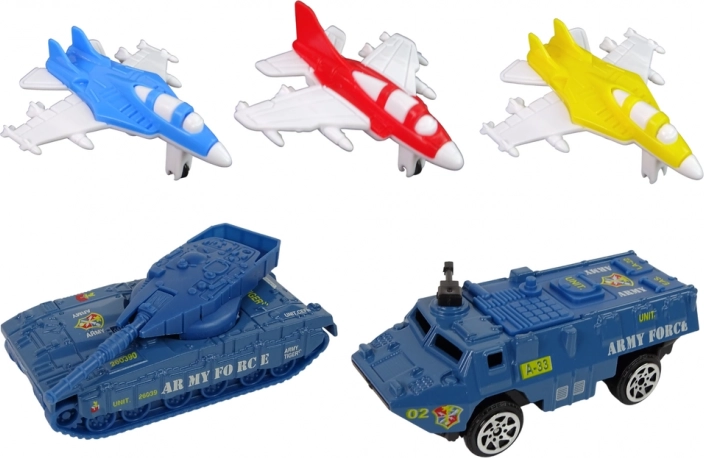 Trzy kolorowe myśliwce, czołg gąsienicowy i pojazd opancerzony z metalową karoserią wnoszą akcję na morzu i na lądzie.