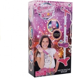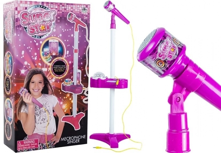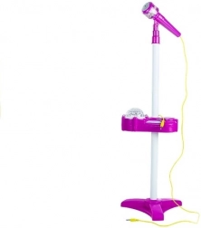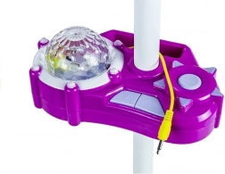 Ten multifunkcyjny dziecięcy mikrofon na statywie zamieni pokój dziecka w małą scenę muzyczną. Interaktywny panel z wbudowanym głośnikiem, przyciskami do zmiany podkładów i regulacji głośności uzupełnia magiczny dyskotekowy projektor, który wyświetla kolorowe wirujące światła. Dzięki dołączonemu kablowi można podłączyć telefon lub odtwarzacz MP3 i śpiewać do własnych piosenek.