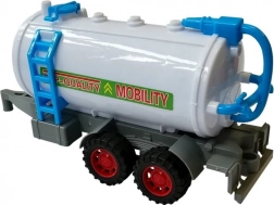 Biały zbiornik z niebieskimi detalami i obracanymi kołami rozszerza scenariusze zabawy o nawadnianie i transport wody na farmie.
