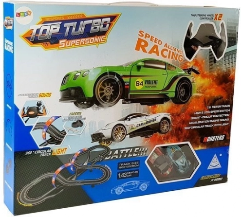 Realistyczny tor wyścigowy w skali 1:43 z dwoma autkami zapewnia prędkość, adrenalinę i zdrową rywalizację. Tor o długości 7,6 m oferuje efektowne pętle z obrotem 360°, kolorowe efekty LED oraz kontrolery z regulacją prędkości i efektami dźwiękowymi. Idealny do wspólnej zabawy dla dwóch kierowców.