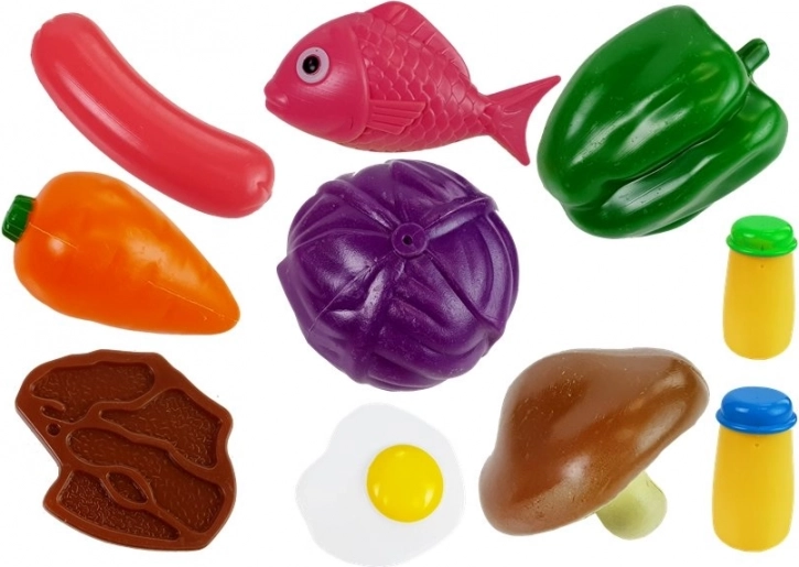 W zestawie znajdują się także różne rodzaje produktów spożywczych, które inspirują do pomysłowej zabawy i nauki nazw oraz kształtów jedzenia.