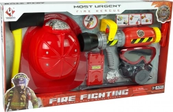 Zestaw strażacki z wodną gaśnicą, maską i czerwonym hełmem
